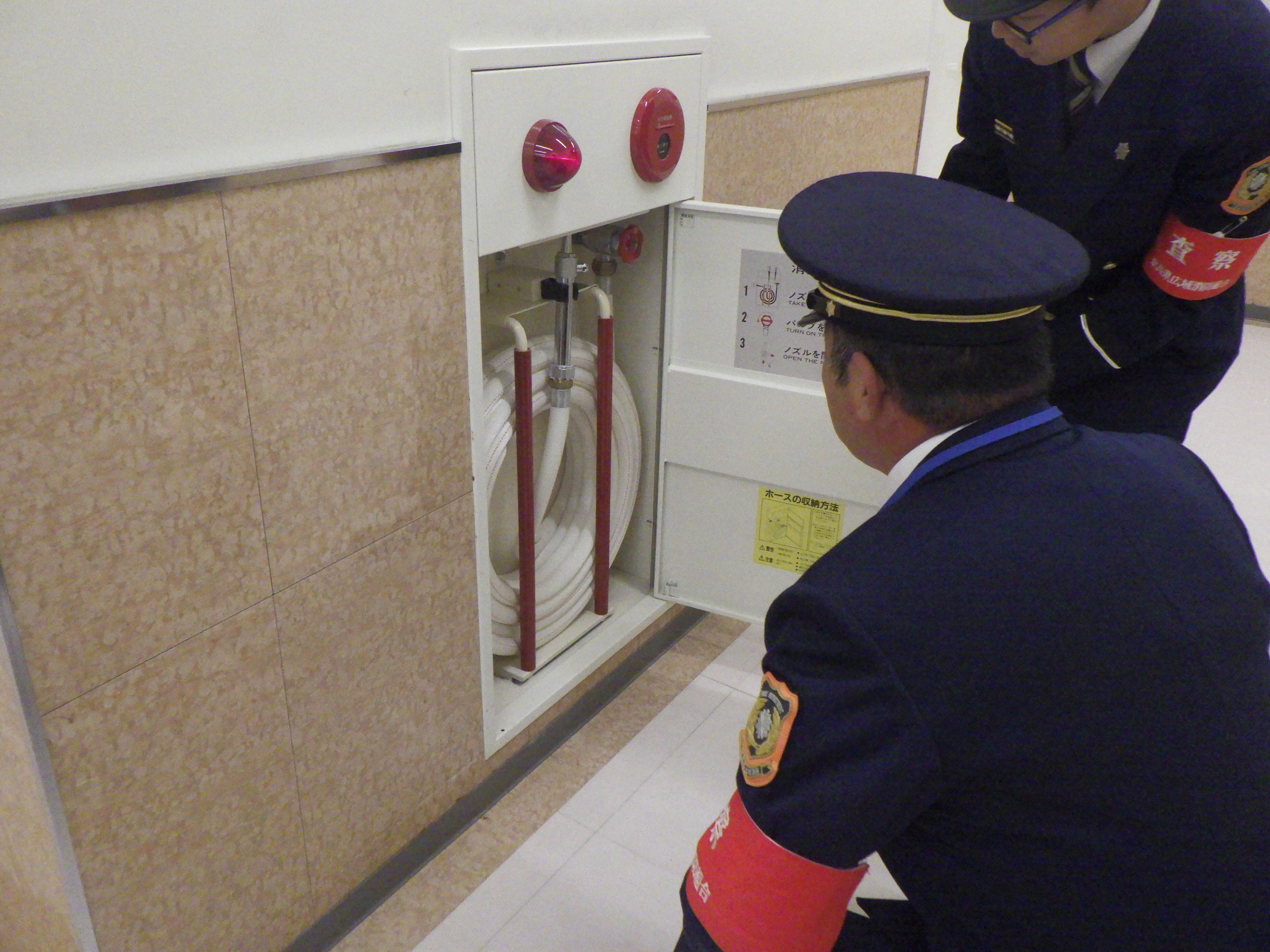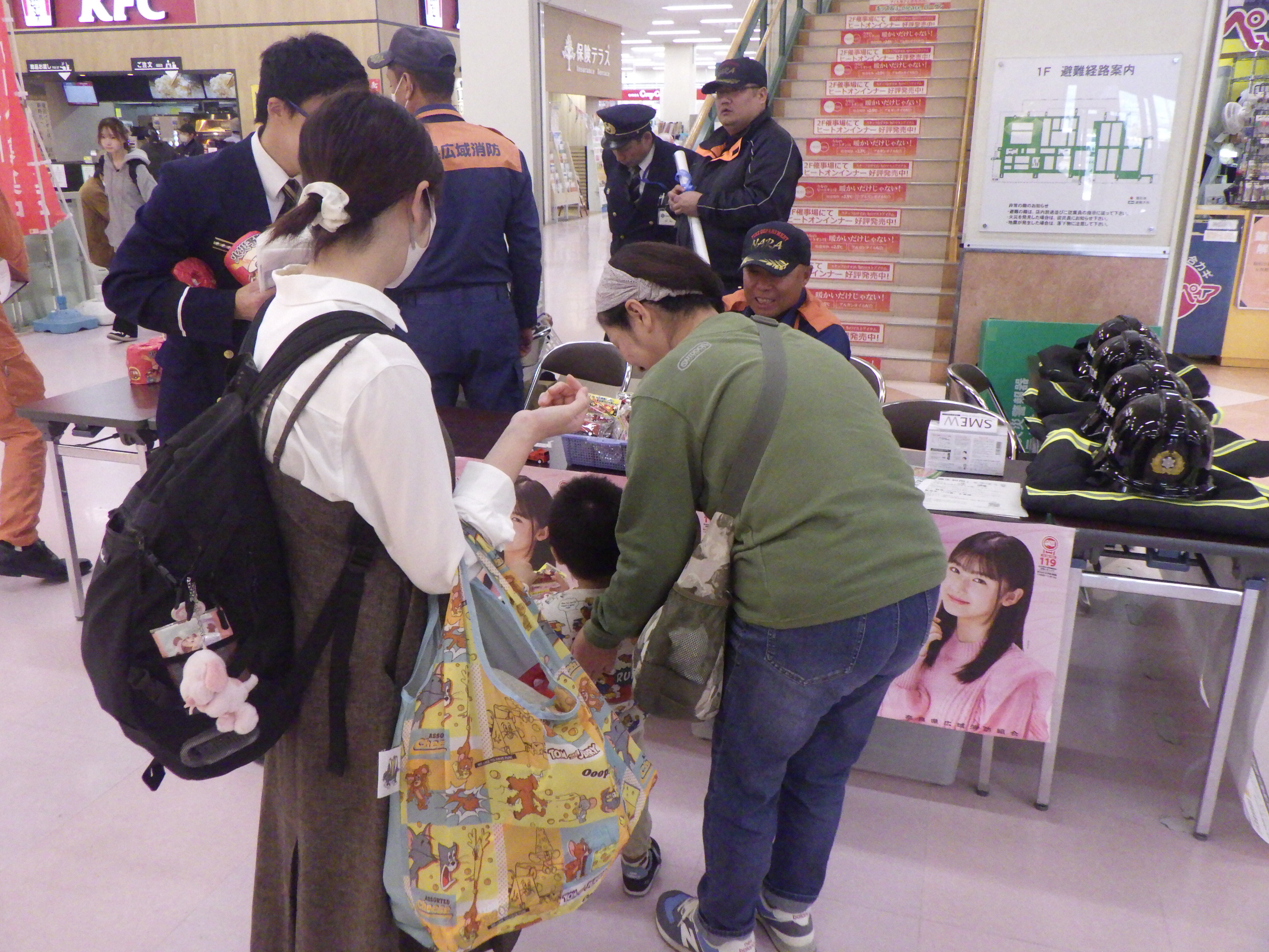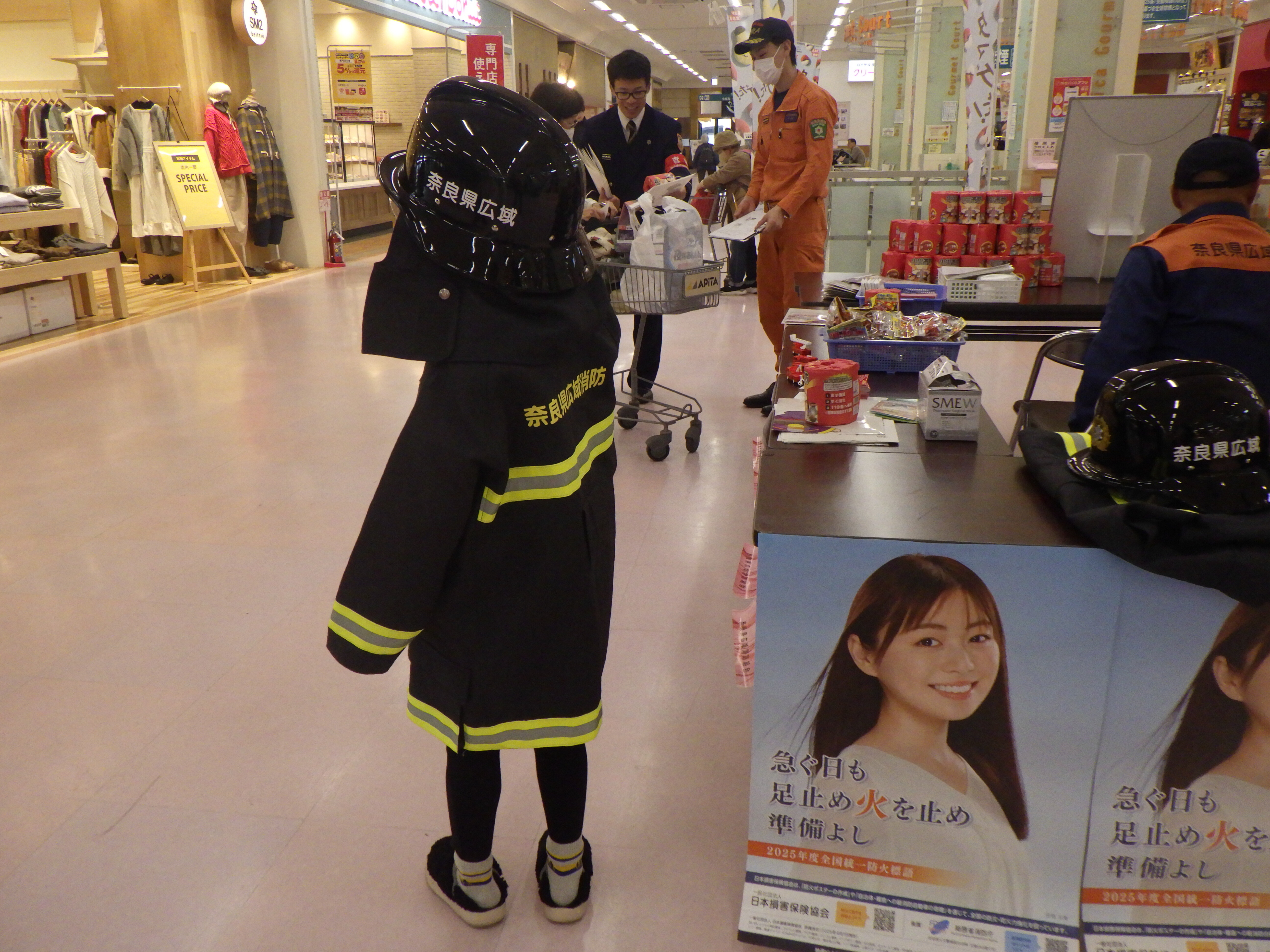 住民へ防火意識の高揚を図ることを目的に、消防署長による査察、啓発ポスターを掲示し子供用の防火服を着用しての写真撮影、住宅用火災警報器や感震ブレーカーの展示パネルを使用して啓発活動を行いました。