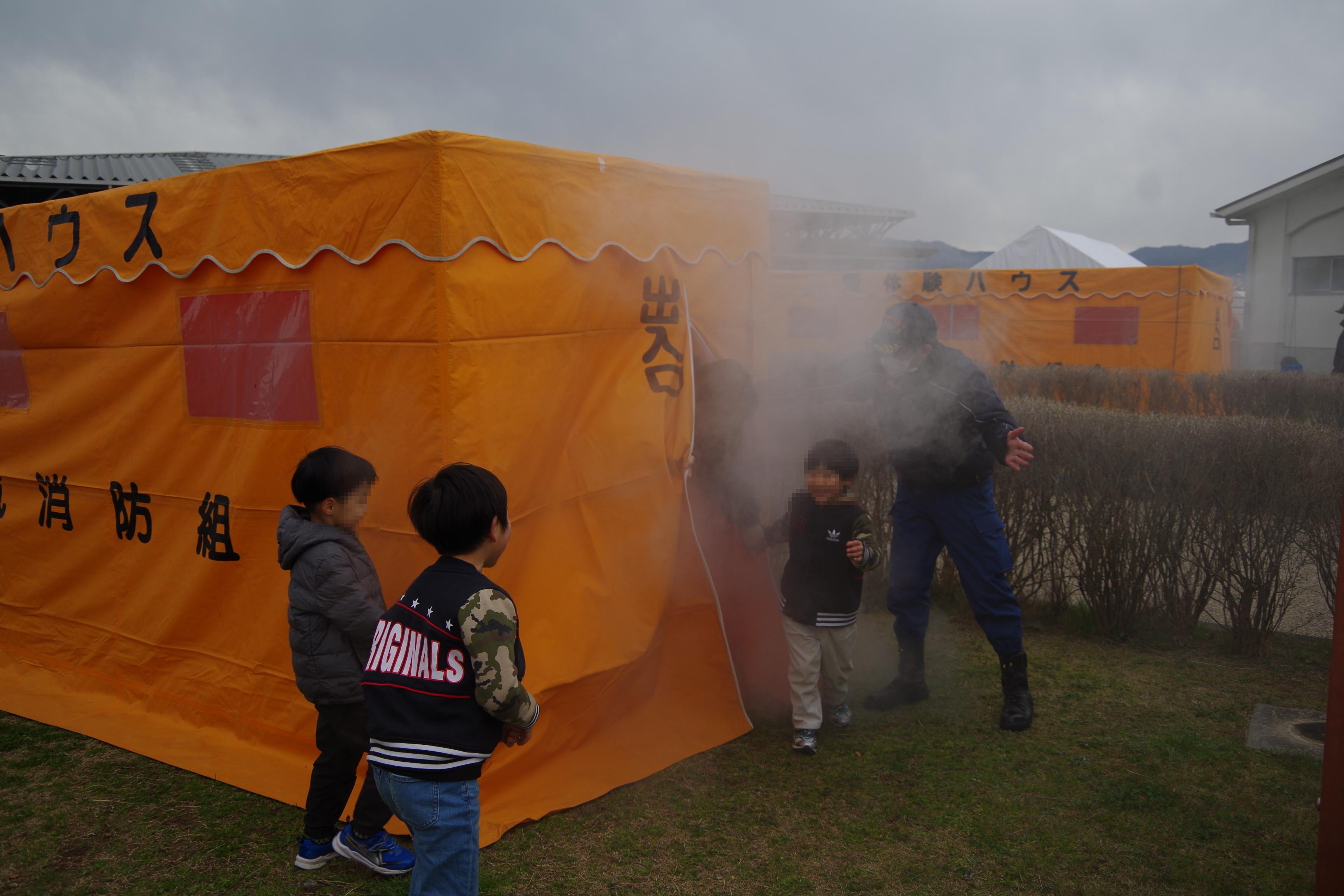 スモークマシンを使用し、火災時の避難を想定して煙が充満したハウス内の歩行体験ができます。