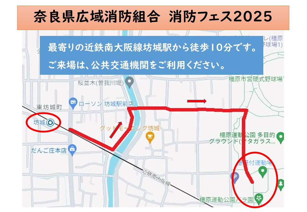 会場は近鉄南大阪線坊城駅から徒歩10分となります。会場までの経路は下記地図を参照。