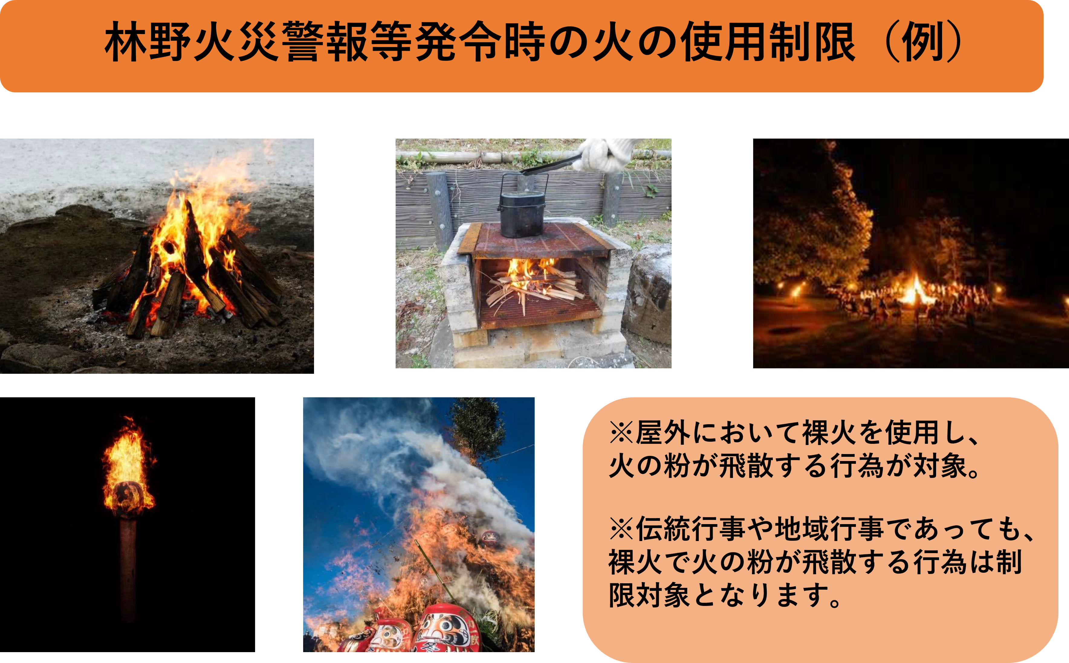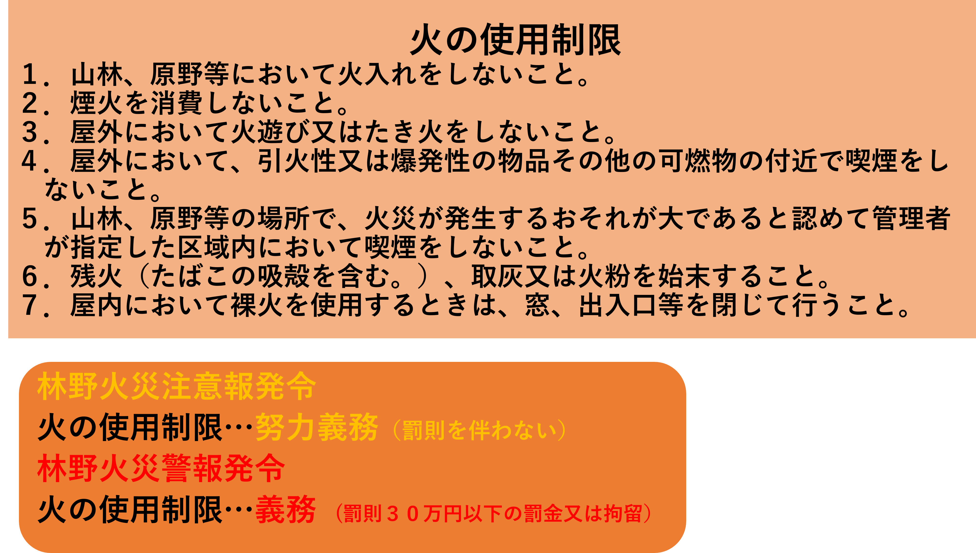 令和7年2月26日に大船渡市で発生した林野火災は、 延焼 範囲が約3,370 h a 、林野火災としては約60年ぶりとなる大規模な林野火災となったことを受け、林野火災多発期(1月から5月)に一定の気象条件に達した場合、「林野火災警報」や「林野火災注意報」を発令し、発令中の「屋外における裸火で火の粉が飛散する行為」を制限することで、林野火災予防の実効性を高めることが必要となりました。
