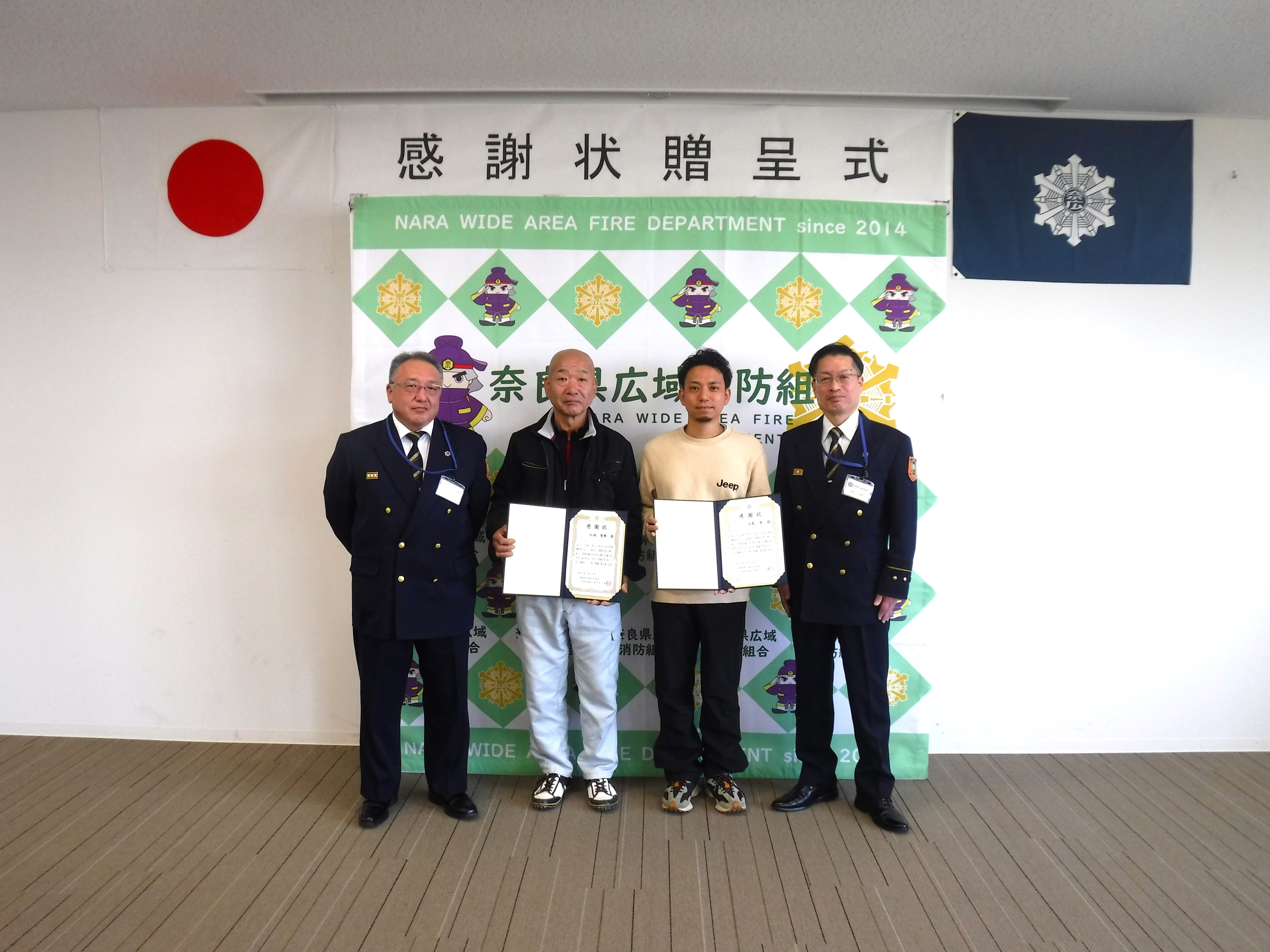 令和7年12月13日、天理市内で発生した火災において、池島様、松岡様は煙にいち早く気づき、迷わず周囲へ知らせ119番通報するとともに、火煙が噴出している中、水道ホースと消火器を用いて的確な消火活動を行われました。